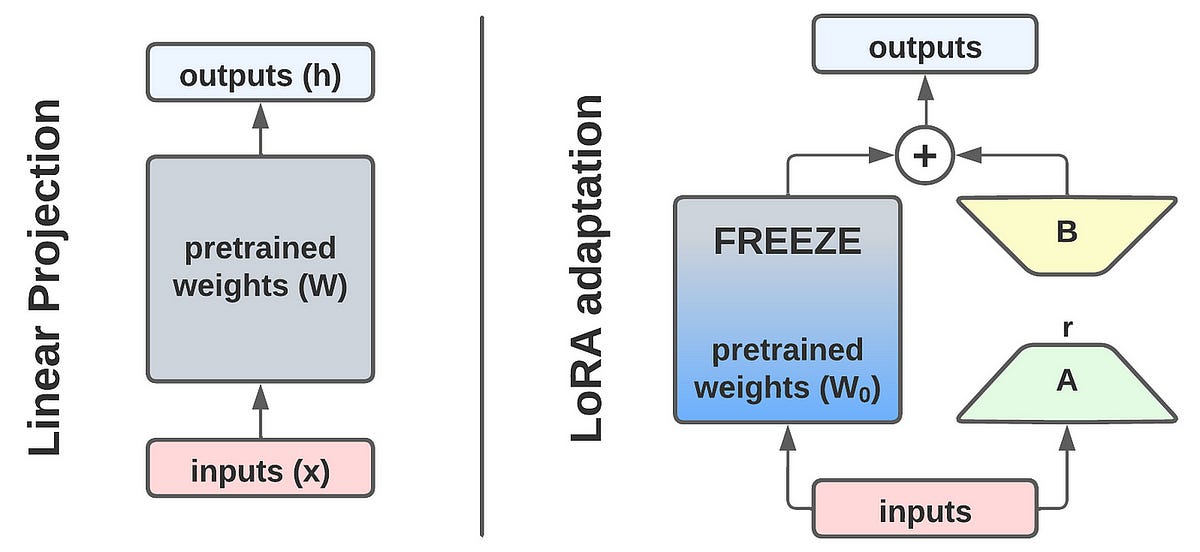 LoRA (Low-Rank Adaptation) works by injecting trainable low-rank matrices into the model’s layers, leaving the rest of the network frozen.